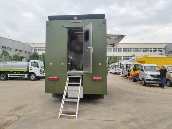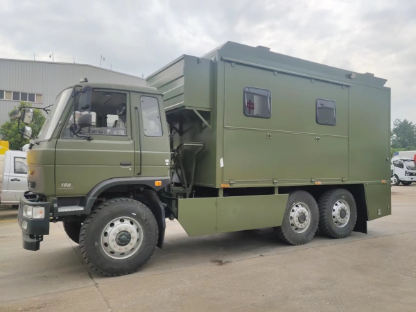 其它 | 1.车厢顶部封闭不可开启;2.该车用于烹饪食品,餐饮加工,车厢内部设备配备有发电机,冰柜,冷饮机,售货台,炊具等;该车装有空调,车顶装有水箱,护栏,车身前部装有爬梯;两侧和后部装有户外照明灯;前面可不选装爬梯,后部可选装爬梯,后部选装双开门;3.侧防和后防均采用:Q235A碳钢,侧面采用焊接加螺栓连接,后部为裙边结构下沿离地高500mm;4.ABS型号为3631010-C2000,生产厂家为东科克诺尔商用车制动系统(十堰)公司;5.随底盘选装驾驶室前脸。 | ||