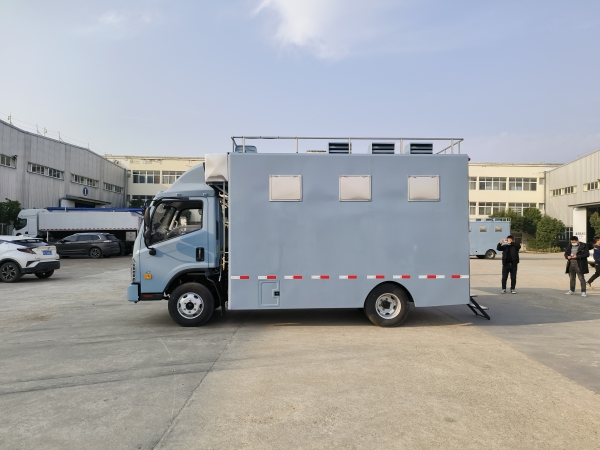 其它 | 1.车厢顶部封闭不可开启;2.该车用于制作膳食,用膳或供应快餐、冷热饮料,车厢内部设备配备有蒸饭柜,冰箱,灶台等;3.尾部侧开门或上掀门,选装侧开门,选装侧面伸缩结构,顶部选装排烟罩、照明灯、水箱;4.侧防护和后防护装置均为裙边结构,后部下沿离地高450mm;5.随底盘选装驾驶室;6.ABS系统控制器型号为CM4XL-4S/4M,ABS系统控制器生产企业为广州瑞立科密汽车电子股份有限公司,该车型可选装ETC车载装置.选装侧开门开启样式。选装外观样式。 | ||